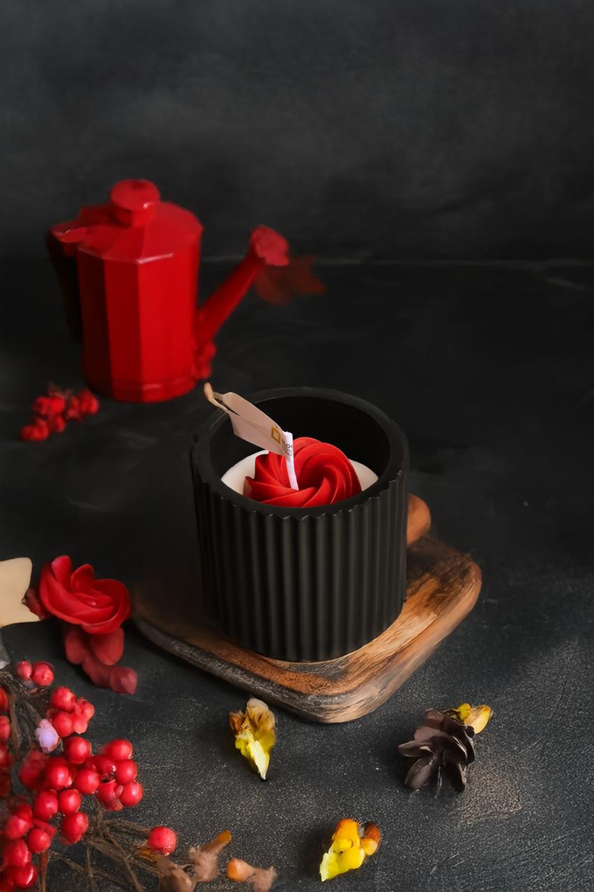An elegant black mold with a modern touch, featuring a cozy, aromatic candle with a delightful shape.